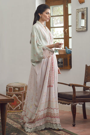 This digitally printed kaftan is a stunning and stylish piece of clothing that is perfect for any special occasion. The kurta features a powder baby pink color that adds a touch of femininity and grace to the overall design. The sleeves are adorned with a hint of green, which creates a beautiful contrast against the soft pink and adds a pop of color to the design. The kurta is further enhanced with a beautiful floral and paisley print in shades of pink, green, and gold. These intricate designs are expertly placed on the kurta to create a beautiful and harmonious pattern that is both intricate and delicate.