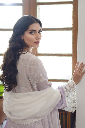 This ensemble features a soothing palette of lavender, complemented by delicate pink florals that lend a touch of femininity. The centerpiece of the attire is a mesmerizing mehrab design, intricately embed to create a stunning focal point. To enhance the overall harmony of the outfit, a geometric neckline has been incorporated, adding a balanced and structured element to the ensemble. This detail not only creates visual interest but also imparts a modern and sophisticated touch to the attire.
