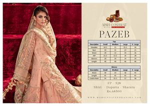 Pazeb is our delightful gulnari pink kameez and Gharara ensemble. The kameez is done in organza and is embroidered in grid like fashion featuring Mughal botah motifs enclosed in lyrical niche patterns done in fine threadwork and embellished with charming accents of embellishments. The matching sharara also made with fine organza makes for a regal look, and is similarly adorned with fine glorious embroidery and sequins along the hemline. It is paired with diaphanous organza dupatta featuring graceful borders of sequins and embroidery trims across all sides.