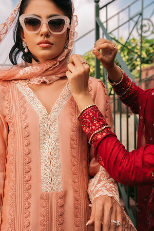 An elegant long coral shirt exudes sophistication with its stunning ivory contrasting embroidery and embellishments along the neckline, hem, and bell sleeves. The meticulous craftsmanship accentuates its feminine allure, while delicate lace insertions and pleat detailing enhance its refined elegance. The shirt is paired with flared pants in raw silk, featuring scalloped edges and organza finishes. Completing the outfit is a coordinating net dupatta in coral, embellished with off-white embroidery and pearl accents to perfectly complement the shirt's intricate design.