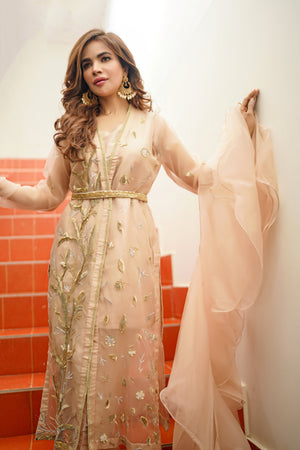A celebration of femininity and elegance. Crafted from luxurious shimmer organza, the long coat exudes a delicate radiance, reminiscent of the soft glow of sunset. Paired with matching pants, adorned with intricate handwork, and cinched at the waist with a hand-embroidered belt, this ensemble embodies sophistication and charm.Each piece is a masterpiece of craftsmanship, with the coat and pants adorned with meticulous handwork, adding a touch of artisanal flair to the ensemble. The delicate embroidery enhances the allure of the outfit, creating a mesmerizing visual symphony that captivates the senses.