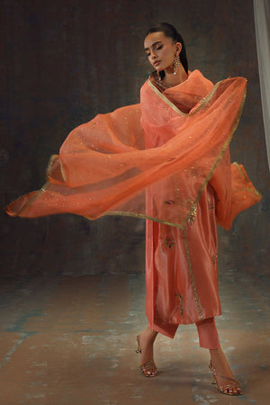 Bathed in the warm glow of coral zari net, this dreamy silhouette is brought to life with exquisite gota and floral hand embroidery, each detail shimmering softly with every movement. It comes with a mukesh dupatta with delicate floral motifs and silk pants. Effortlessly versatile, it transforms from regal to romantic.