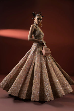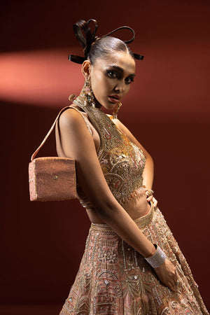 Halter choli with Lehnga Delight'Embrace the ethereal allure of 'Peachy Charm' where timeless elegance meets contemporary grace. This ensemble captivates with its mesmerizing peach pink hue, adorning the wearer in a hue reminiscent of delicate blossoms at twilight. The halter choli, adorned with intricate Sequence embroidery detailing in floral and geometric motifs using the finest jewellery material, accentuates the neckline with poise and allure. The mermaid-style lehnga gracefully drapes, celebrating the feminine silhouette, while the bridal dupatta, fashioned with a square bag stitch, completes this ensemble with sophistication and finesse. With each stitch exuding opulence and each detail celebrating tradition, this attire resonates as a testament to refined charm and timeless allure.'