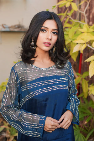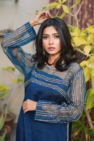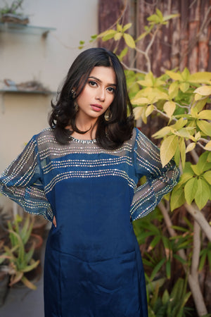Step into a realm of enchanting beauty with our "Peacock Elegance" ensemble, where the mesmerizing hues of peacock blue meet exquisite craftsmanship. Crafted from luxurious Korean raw silk, the dress features trendy crystal work adorning the body, sleeves, and back, creating a captivating symphony of sparkle and allure.Paired with culottes for a modern twist, the ensemble exudes contemporary sophistication. The organza dupatta, adorned with crystal embroidery, adds a touch of ethereal charm, draping gracefully and completing the ensemble with finesse.