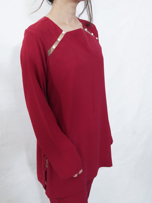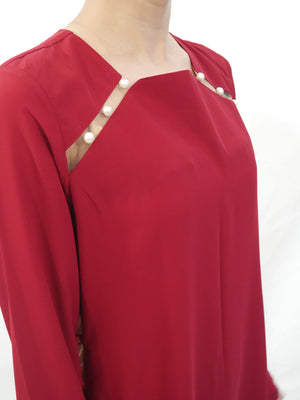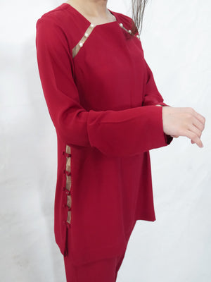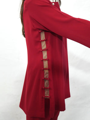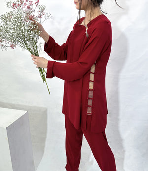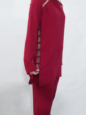 "Step out in style with the Pearl-Accented Red Hot Set. This deep red matching set features intricate net and pearl details on the sleeves and slits, elevating your look to the next level. Perfect for a special occasion or a night out on the town, this set is sure to turn heads. Shop now for a sultry and sophisticated outfit that is sure to make a statement.