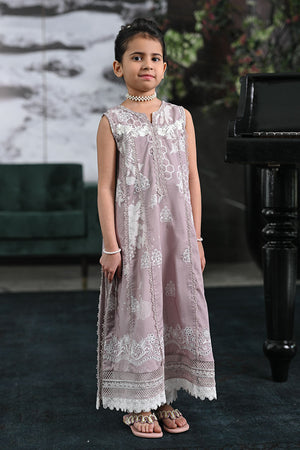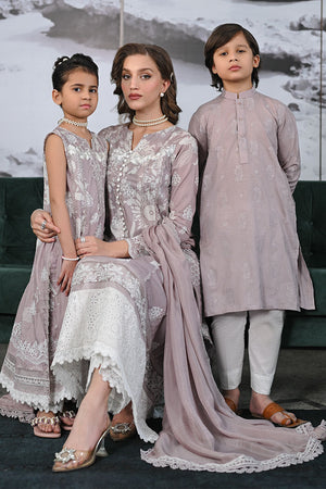 A graceful light mauve long shirt, beautifully adorned with white print and a delicate lace border, complemented by fitted sleeves for a refined silhouette. Paired with a pristine white izaar and a luxurious mauve silk dupatta, finished with lace borders.