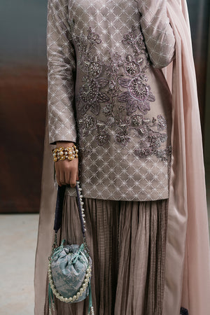 Ethereal and elegant, Peony is a delicate fusion of tradition and modern charm. This round-neck organza shirt, adorned with intricately embroidered and embellished florals, is further enhanced with a soft, all-over print and a contrasting lining for added depth and dimension. Paired with a beautifully crushed Thai silk gharara, this ensemble exudes effortless grace. The medium silk dupatta, featuring embroidered corners on each end, is finished with three-dimensional tassel detailing, making it a statement piece perfect for celebrations.