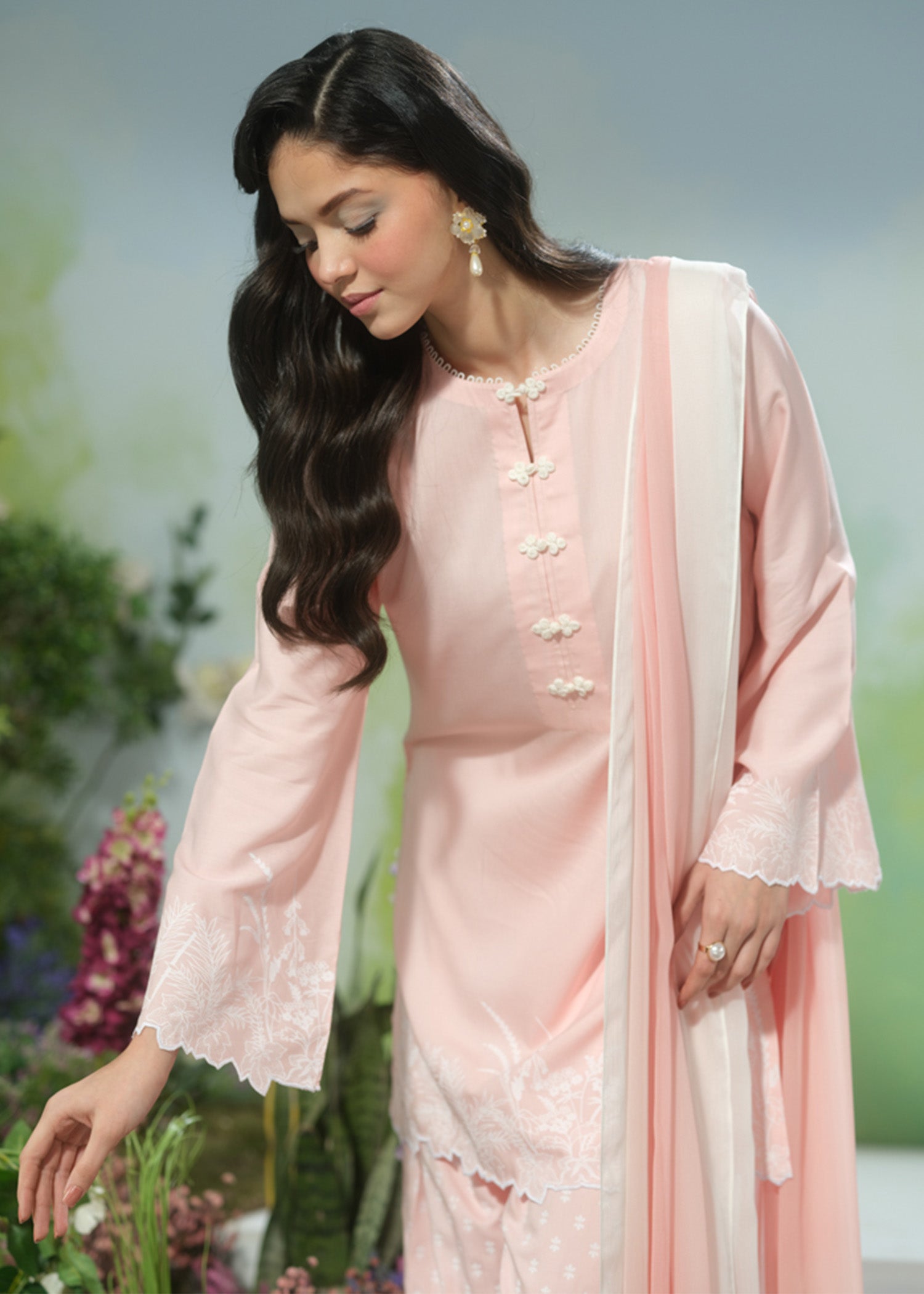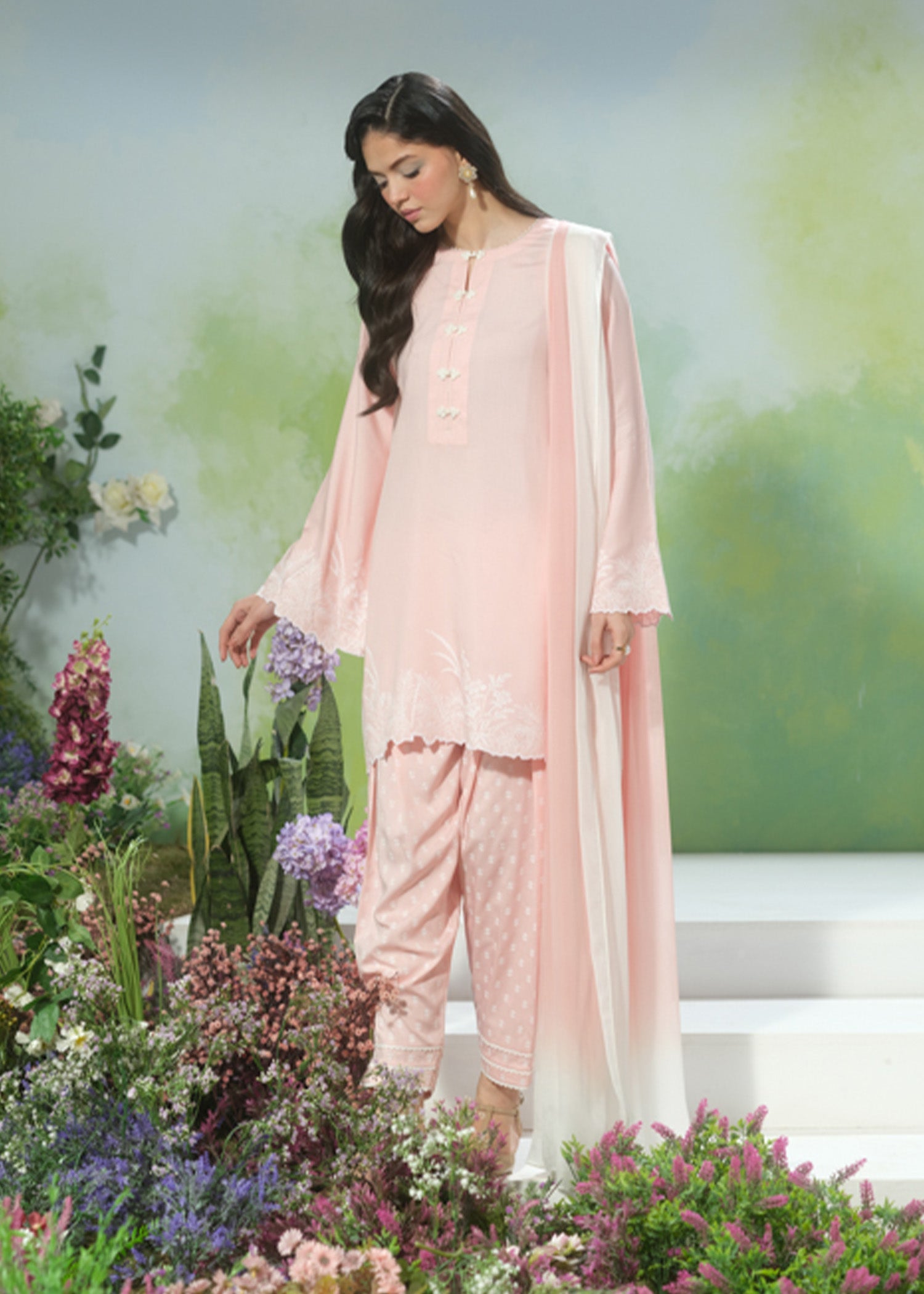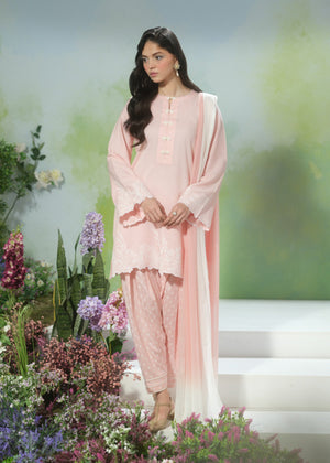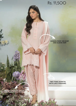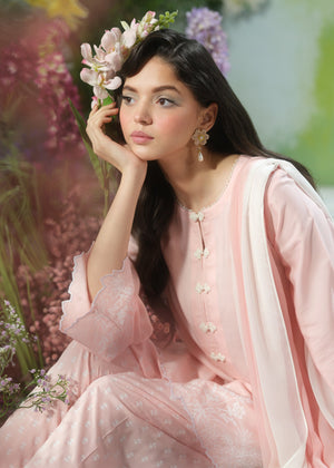 This exquisite powder pink kurta is designed with a screen-printed daman, adding a unique and artistic touch to the traditional silhouette. The kurta is perfectly complemented by a screen-printed Khari Shalwar, featuring delicate lace detailing that enhances its elegance. Completing the ensemble is a two-tone chiffon dupatta, lightweight and breezy, that flows beautifully, making it a perfect choice for any occasion that calls for grace and style.