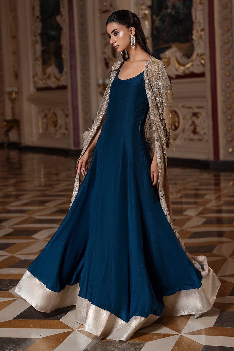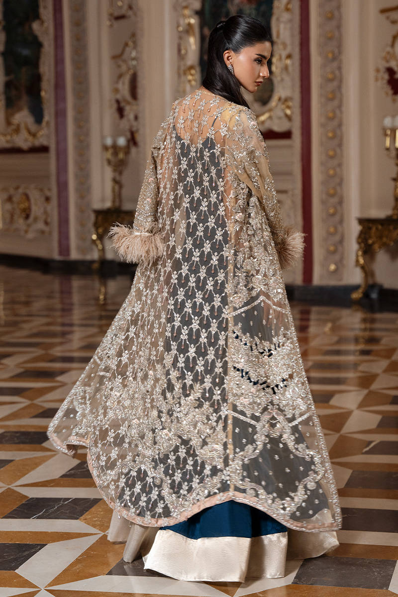 It is paired with a heavily embellished cross-neck blouse, enhancing the overall sophistication of the ensemble. The outfit is completed with a luxurious silk skirt, which embodies timeless elegance and refined beauty, making it an ideal choice for those seeking to make a statement at any occasion.
