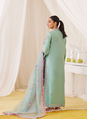 The Petra Fern outfit embraces modern elegance with traditional charm. Pure raw silk in a soothing seafoam green hue is paired with intricate threadwork, primarily floral motifs in gorgeous pastel hues to create an easy to wear, yet versatile look. The pure organza dupatta with embroidered borders gracefully completes your ensemble. Style yours with our matching pure silk izaar and some sparkly flats to steal the show!