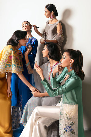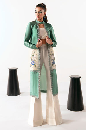 "Teal" – a vibrant ensemble that effortlessly blends the cool allure of teal green with pristine white. This ensemble features an embroidered front-open jacket crafted from luxurious tissue silk, showcasing a dynamic play of color blocking. The accompanying bootcut trouser, made from exquisite Thai silk, boasts a subtle underbody for added flair. To complete the look, the ensemble comes with a stunning organza sequins spray dupatta, elevating the outfit to a perfect blend of sophistication and modern style.The shipping charges for all articles barring Bridals are as follows: