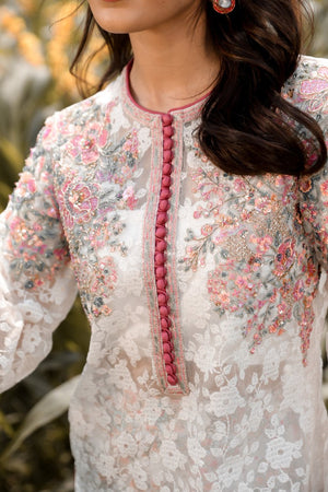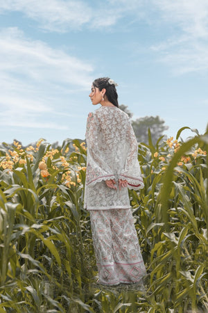 An alluring white self-embroidered organza short shirt with embellished motifs completed with embellished bell sleeves. Paired with screen printed raw silk plazo pants.