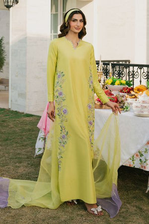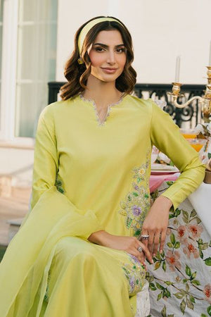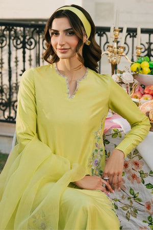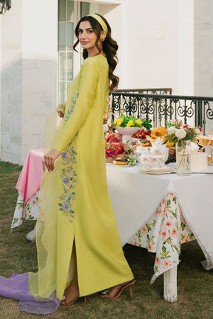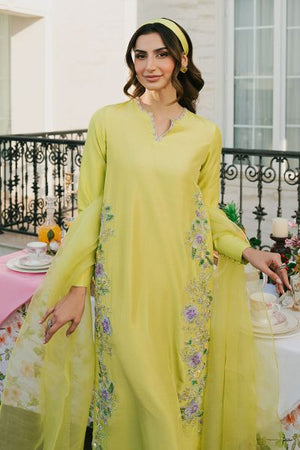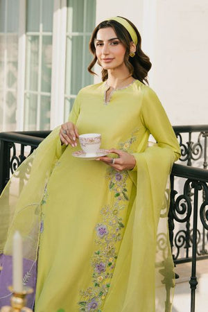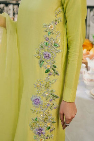 This enchanting outfit in a refreshing light parrot green color exudes elegance and modern charm. The long shirt features unique, beautifully placed embellishments that form delicate motifs, adding an artistic touch to the silhouette. The straight trousers offer a sleek and sophisticated fit, balancing the ornate shirt with understated grace. Draped over the ensemble is a two-tone organza dupatta, its soft, ethereal fabric gently blending hues to create a stunning contrast that enhances the outfit's overall appeal. The combination of intricate detailing, airy fabric, and fresh color makes this outfit a perfect choice for spring or summer events, offering both style and sophistication.