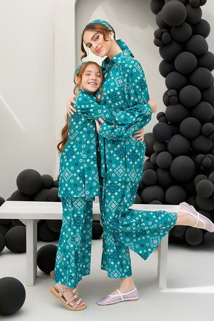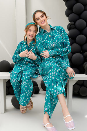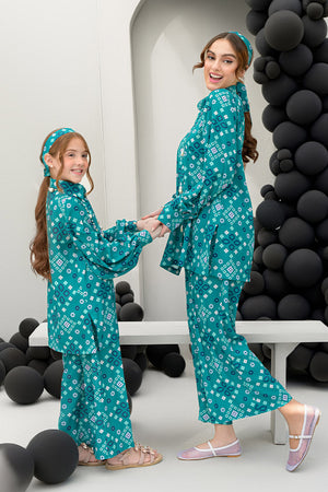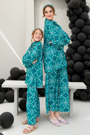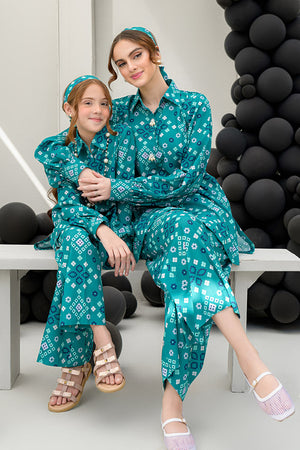 Introducing the Pine Whisper co-ord set, a beautiful ensemble that channels nature’s tranquility. This set features a short buttoned shirt in a rich dark green hue, enhanced with delicate pearl details at the front for a subtle touch of elegance. Paired with stylish culotte pants, it offers a modern, relaxed silhouette that is both chic and comfortable. Crafted from soft crepe fabric, the Pine Whisper set is perfect for casual outings, office wear, or weekend gatherings, delivering effortless style with a hint of sophistication. Note: Kids' lengths will be according to the size chart.