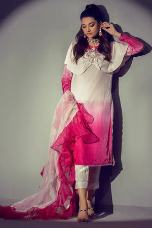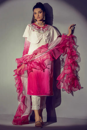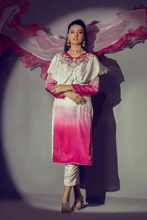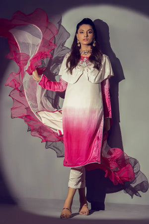 Premium tie and dye russian silk shirt styled with cape which is embellished with handwork of kora, dabka, pearls, sequins and stones styled with capri pants and organza dopatta with contrast color frills. Weight of this product is 1