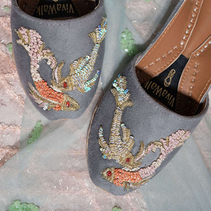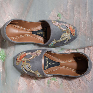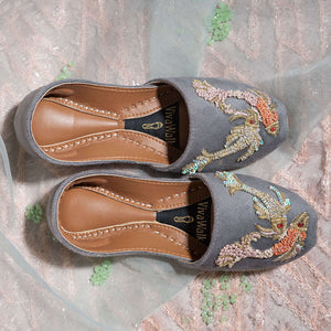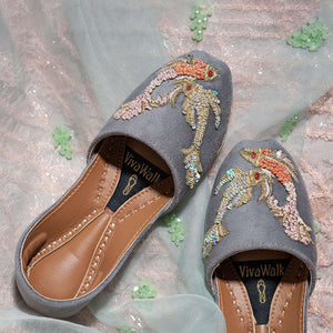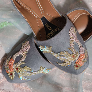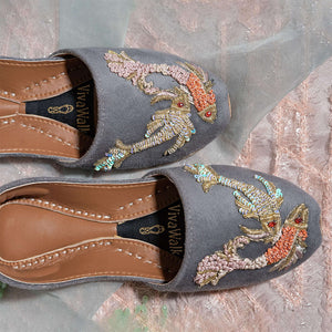 Introducing the premium “Pisces” khussa, a perfect blend of traditional artistry and contemporary style. These handmade shoes feature intricate multi-colored Resham work, sequins, beads, and dabka, creating a vibrant and eye-catching design. Crafted with a luxurious velvet upper and a durable leather sole, they offer both comfort and longevity. Each pair is meticulously handmade in 5 hours, showcasing exceptional craftsmanship. Ideal for special occasions or for adding a touch of elegance to your everyday look, “Pisces” khussas are true statement pieces. Order now to let your feet shine with elegance in every step!
