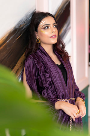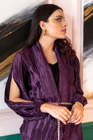 A tinge of plum never hurt nobody! The intricately self-pleated blazer is draped with our signature gold chain that adds a little bling to your wardrobes; just like the amethyst gemstone, #UnleashTheInnerSolitaire in you!