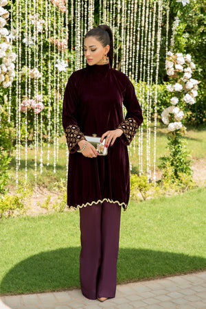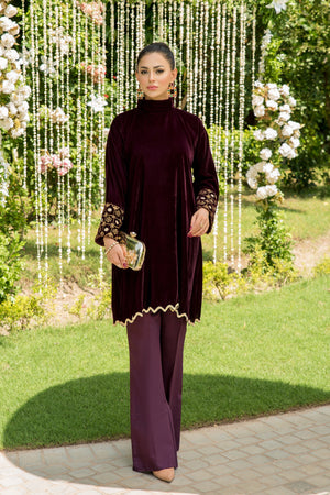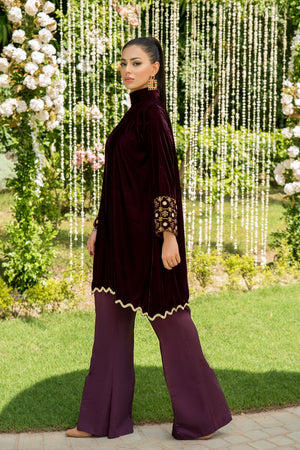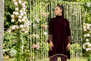 •Details: Turtle neck cape shirt with Tilla embroidered sleeves, while paired with raw silk pants.