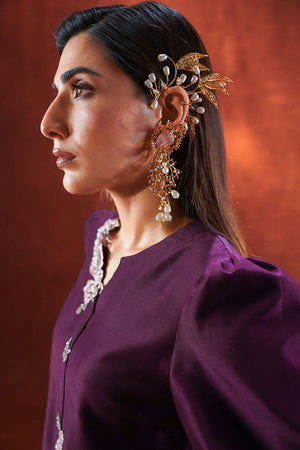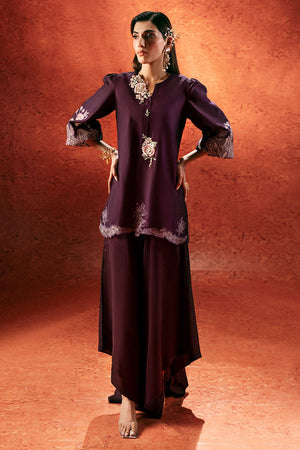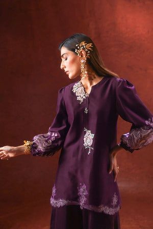 A breathtaking short shirt crafted from pure raw silk in the season's signature hue, radiating timeless elegance and contemporary charm. The design is elevated with intricately hand-embellished motifs, masterful embroidery, and delicate appliqué details that flow seamlessly across the fabric. Adding a bold yet sophisticated edge, the experimental puff sleeves make this ensemble a true style standout. Paired with free-flowing pants, this outfit strikes the perfect balance between effortless grace and head-turning appeal.