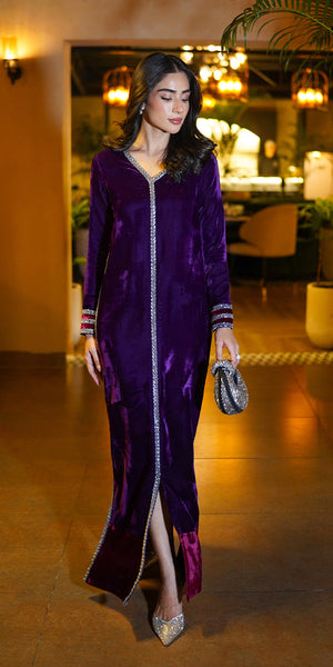 A graceful drop-length, front-open dress exuding elegance with its crystal-beaded neckline and shimmering side trim. The subtle color-block detailing adds a contemporary twist, making it the epitome of luxurious style for your winter soirées.