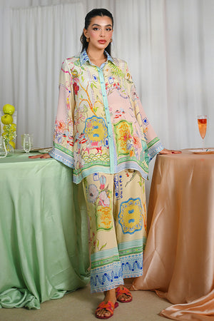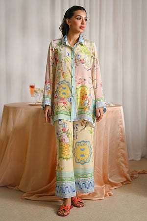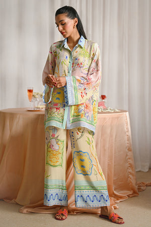 Embrace effortless elegance with 'Poesie' – a stunning co-ord set featuring a delicate lemon button-down shirt paired with printed culottes. The shirt boasts a dreamy pastel watercolor print on pure crepe.