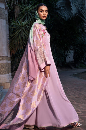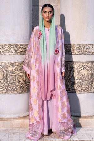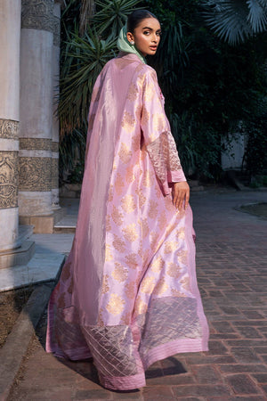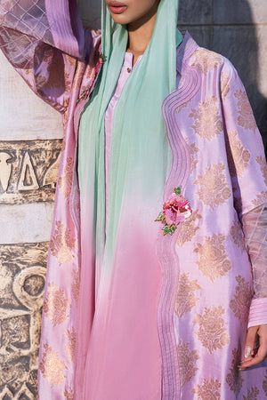An eye-catching powder pink long jacket, crafted from pure jamawar, featuring intricate floral motifs that exude timeless elegance. The look is elevated with a beautifully detailed inner, accented with delicate buttons that lend a refined Middle Eastern aesthetic. Paired with a dual-toned, contrasting scarf, this ensemble is effortlessly graceful—making it the perfect choice for occasions.