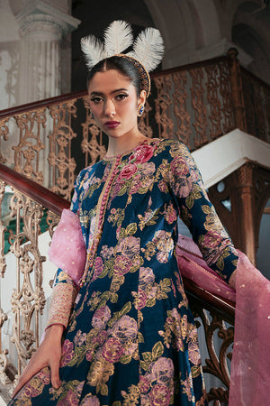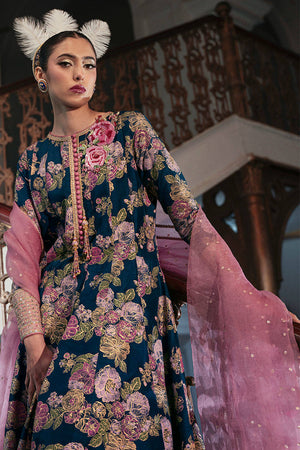 "Printed Gale" is a stunning electric blue raw silk kalidar, featuring a delicate floral print and intricately hand-embellished motifs on the bodice. The addition of contrasting pink loop buttons with tassel detailing adds a bold, eye-catching element to the design. The kalidar’s sophisticated charm is further enhanced by fitted full sleeves and beautifully embroidered borders along the cuffs and hem. To complete the look, a contrasting pink organza dupatta, adorned with a shimmering sequin spray, adds an ethereal touch. Paired with crushed trousers to introduce a modern fusion, this ensemble is sure to turn heads at any event, seamlessly blending tradition with contemporary style.