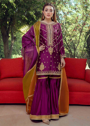 Description: A delicately stitched gharara can never run out of the global fashion scene. Keep the traditional style alive, in our magenta Shirt gharara, cut out on 100% pure tissue organza, embellished with complimenting gold gotta hand-work on the shirt with boat-neckline, and straigh-loose-fit sleeves bordered with gold gotta hand-work. To add more style to the look, we have adorned the gharara with similar gold gotta hand-work, while pairing the look with multi toned magenta and contrasting yellow-ochre organza dupatta stitched in ralli styled pattern.