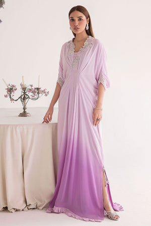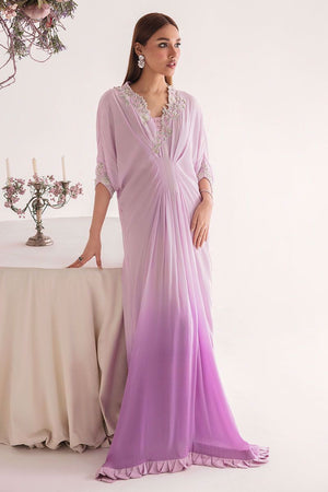 A perfect fusion of modern classy look in lilac colour ombre style grip kaftaan floral designed pattern highlighted with motifs of Zari, Dabka, And Sequin making this outfit timeless classic to make you stand out stunning