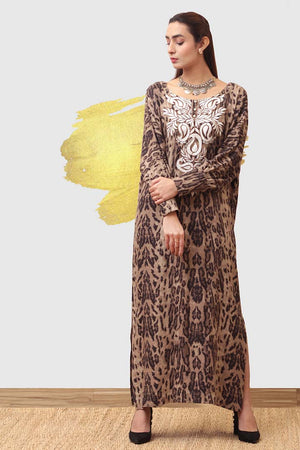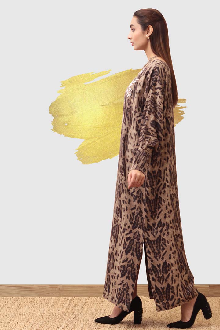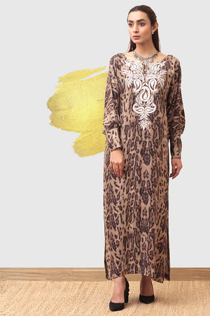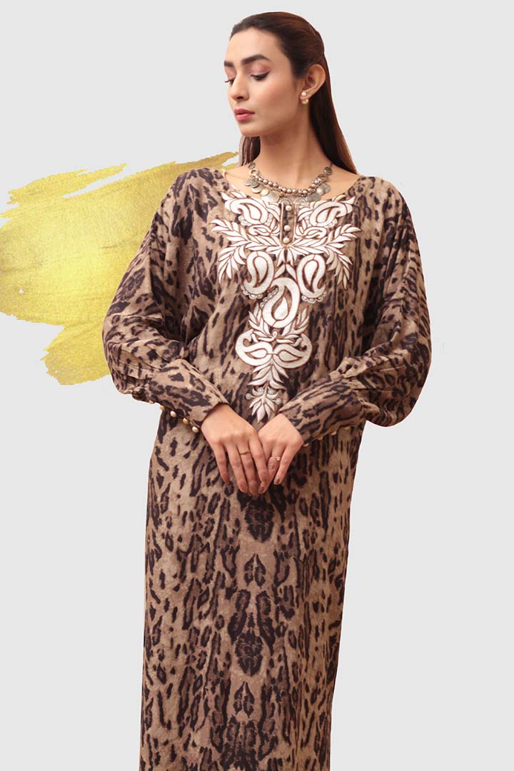 A long printed kaaftaan with handmade nickeline with dori, finished with cuffed sleeves an front loop buttons