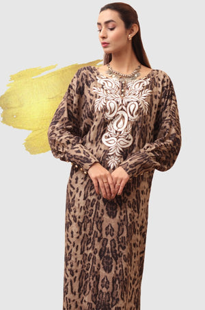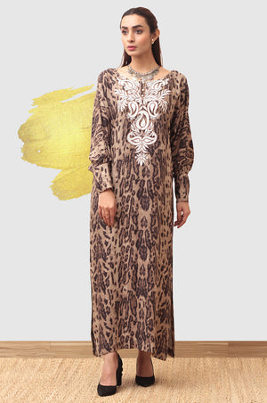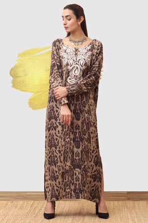 A long printed kaaftaan with handmade nickeline with dori, finished with cuffed sleeves an front loop buttons.