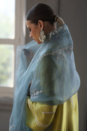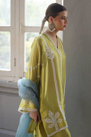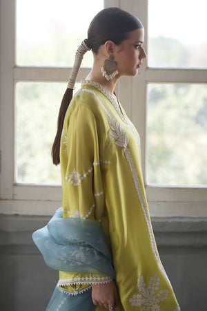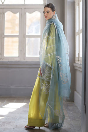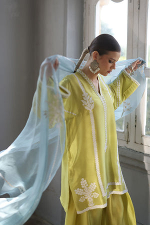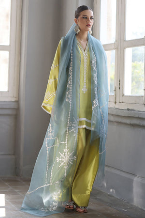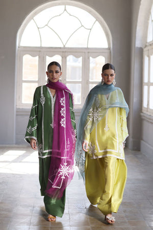 This elegant Short Kurta set is crafted from luxurious Pure Shisha Silk, offering both style and comfort. The shirt features exquisite Embroidery and Applique Work, adding a refined, artistic touch to the design. The sleeves and back are adorned with delicate Screen Print, giving the kurta a unique and contemporary flair. Paired with the shirt is a Pure Shisha Silk Shalwar, complementing the kurta perfectly for a balanced, sophisticated look. The ensemble is completed with a Pure Organza Dupatta, featuring an all-over Screen Print, adding a soft and graceful finish to the outfit. This beautiful set is perfect for formal occasions or festive celebrations, blending traditional craftsmanship with modern elegance.