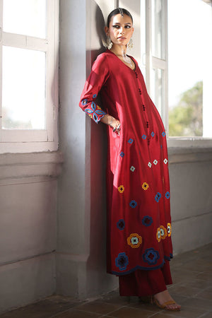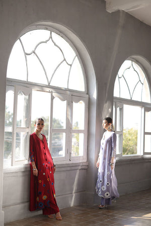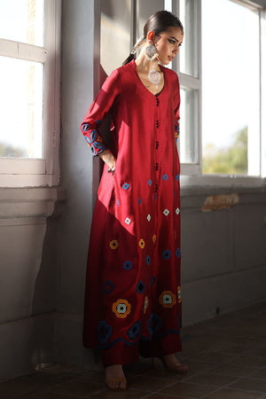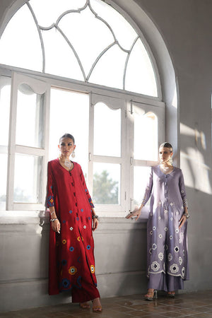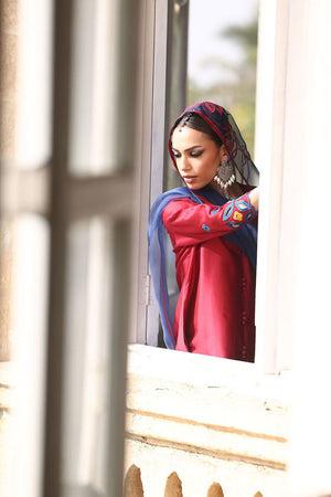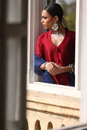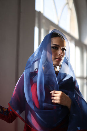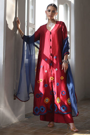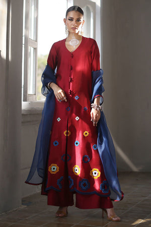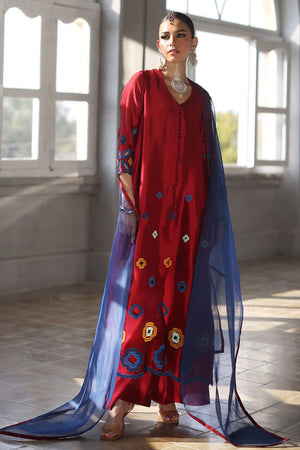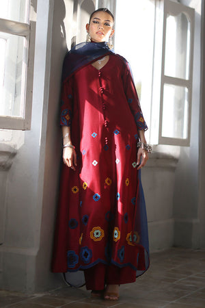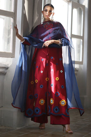 This elegant outfit features a front-open shirt crafted from luxurious pure Shisha silk, exuding a rich, lustrous finish. The shirt is beautifully adorned with intricate embroidery and applique work on the front and sleeves, adding a touch of artistic flair. Paired with pure cotton silk culottes, the set offers a perfect balance of comfort and sophistication. The dupatta, made from fine pure organza, is gracefully embellished with matching embroidery and applique work, completing the look with an air of refinement. Ideal for formal gatherings or festive occasions.