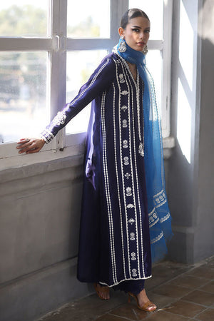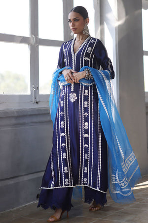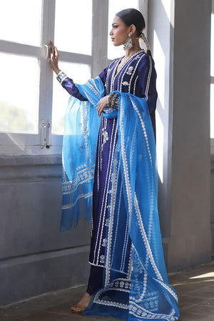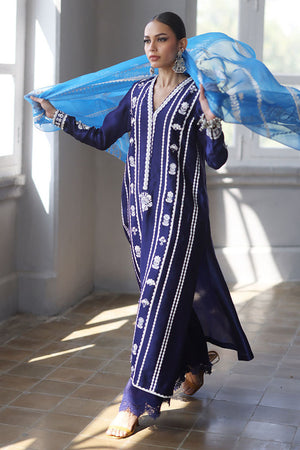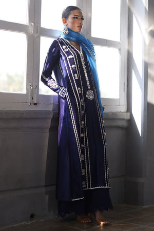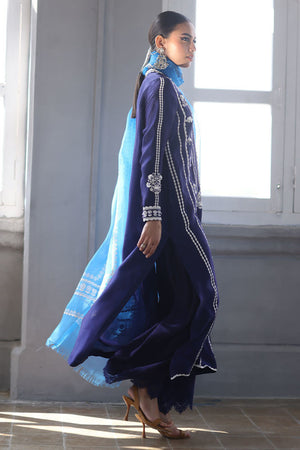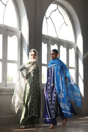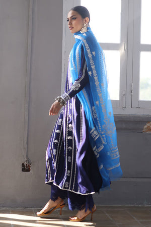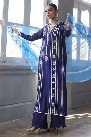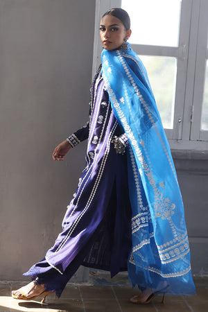 This elegant ensemble combines luxurious fabrics and exquisite detailing for a truly refined look. The shirt, crafted from pure Shisha silk, features a long, flattering silhouette with a delicate screen print and intricate handwork on the front. Adorned with 3D flowers, sparkling crystals, and pearls, the shirt exudes a sophisticated charm. Paired with pure cotton silk culottes, the design is further enhanced by a lace trim at the bottom, adding a touch of femininity. The pure organza dupatta completes the outfit with its all-over screen print design, complemented by handcrafted tassels hanging from the edges, bringing a playful yet graceful finish.