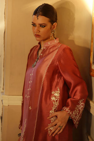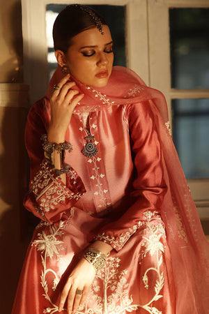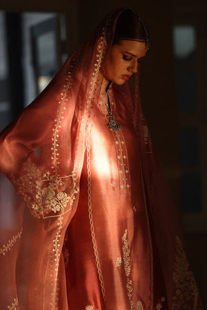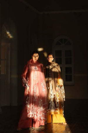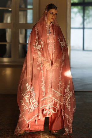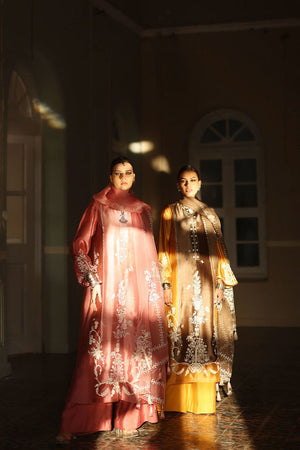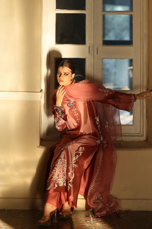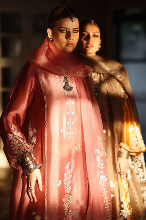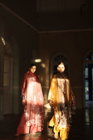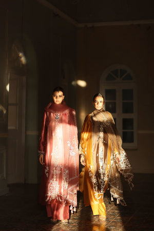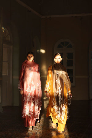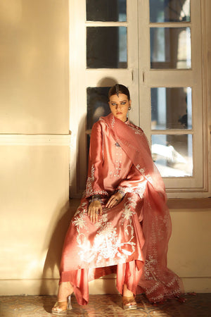 This elegant ensemble effortlessly combines luxury and intricate craftsmanship. The shirt, made from pure Shisha silk, is adorned with stunning screen print and handwork detailing, featuring delicate 3D flowers and pearls on the front and sleeves. The intricate embellishments add a sophisticated and textured appeal, making the shirt a true statement piece. Paired with pure cotton silk culottes, the outfit offers both comfort and style, creating a graceful silhouette. The pure organza dupatta is a showstopper, with an all-over screen print design, complemented by beautifully handmade tassels hanging from the edges.