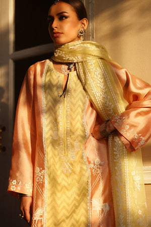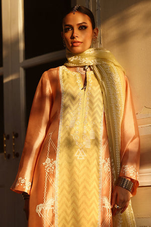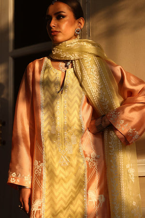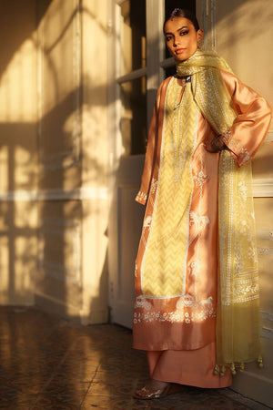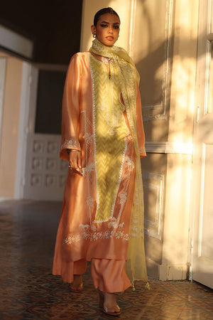 This stunning outfit features a loose-cut shirt made from pure Shisha silk, beautifully adorned with intricate screen printing and embroidery on the front and sleeves. It is paired with culottes made from pure cotton silk, offering both comfort and elegance. The look is completed with a pure organza dupatta, which showcases an all-over screen print design and is finished with handmade tassels hanging from the edges, adding a delicate touch. Combining contemporary style with traditional craftsmanship, this ensemble is perfect for a formal or festive occasion.