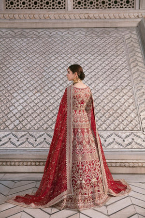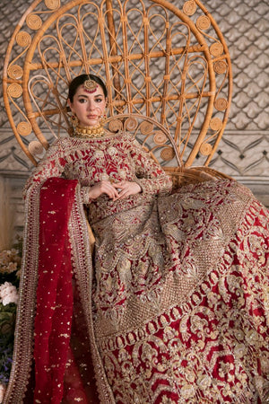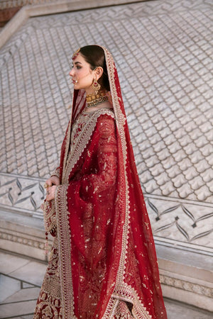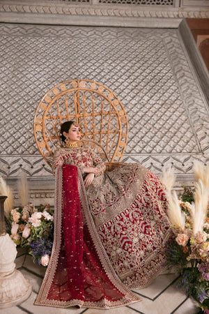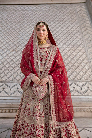 Raania is a traditional look for the Baraat occasion, this ensemble consists of a classic red hued lehnga choli. The paneled organza lehnga consists of motifs enhanced with sitara, dabka, and naqshi. The choli is fully hand worked with intricate motifs and gleaming details. The outfit is paired with heavily embellished all around border organza dupatta with center spray of motifs and pearls.Choli: Organza
