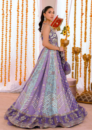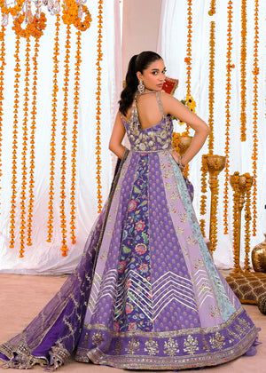 This breathtaking pishwas showcases a timeless print that effortlessly blends elegance with traditional embellishment. It cascades beautifully over a delicate organza lehenga, accentuated by a heavily embroidered dupatta that adds a whimsical flair.
