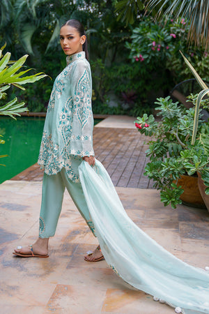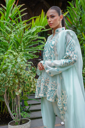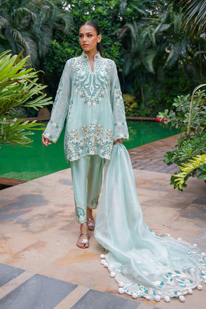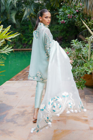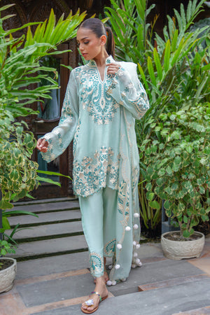 A delightful pale mint khaddi corduroy shirt is emblazoned with tonal aari embroidery elevating the relaxed tunic. It is complemented with a cascading organza dupatta, featuring a scalloped fully embroidered pallu with playful pompom details, and a pure rawsilk shalwar with embroidered hem.