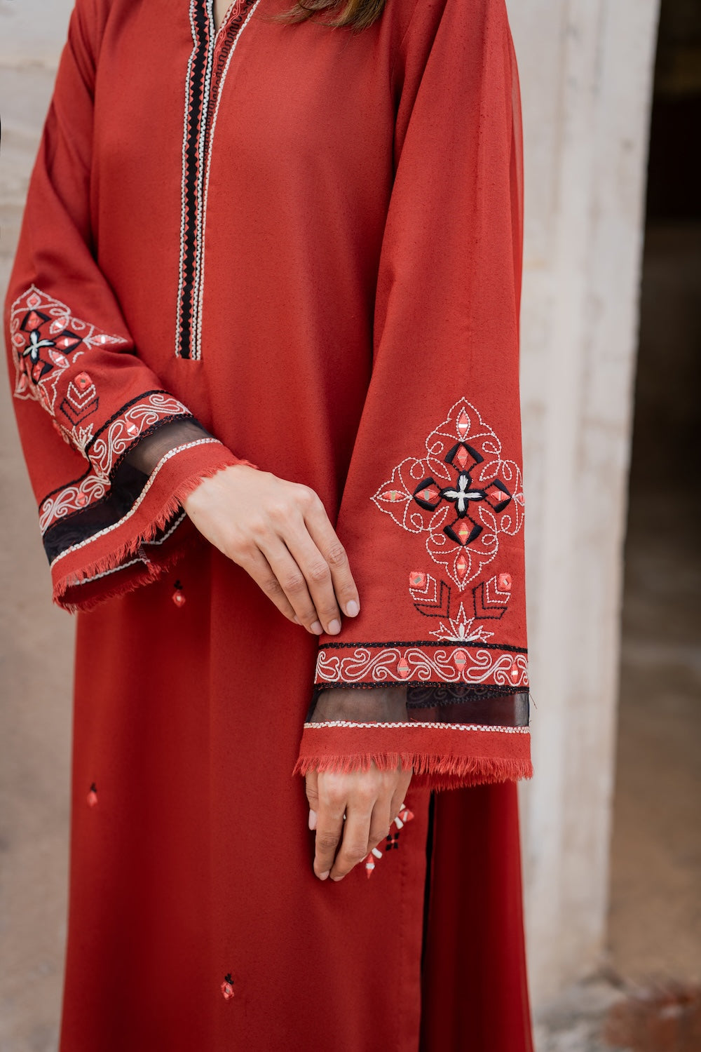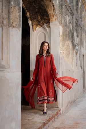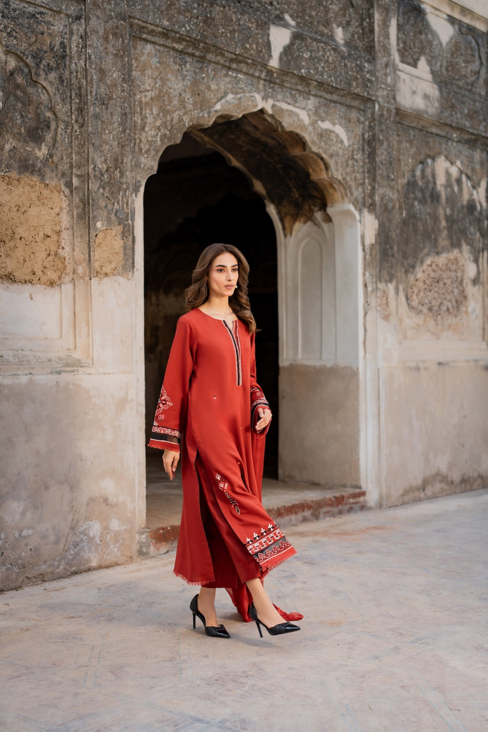 This burnt orange bliss features effortless grace in every stitch. The intricate embroidered motifs grace the shirt front, while the hem and delicate organza patch, add that seasonal sparkle. Perfect for turning heads and staying chic all night.