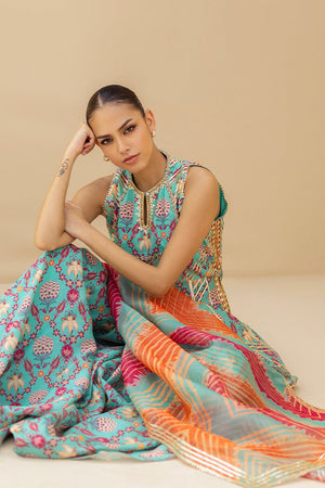 In a deep powder blue hue with hints of blush, lavender and hot pink this sleeveless, front open peshwas is cut from a featherlight khaddi silk that moves with ease. The flowing silhouette features a delicate print elevated with gota details and an embroidered bodice with subtle keyhole neckline. A multi hued organza dupatta with gota borders lends to the romanticism of the ensemble. Paired with matching cascading flared pants cut from khaddi silk, complementing the front open silhouette effortlessly.