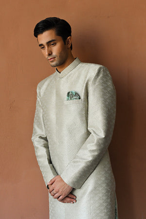 A dreamy tea green hued rawsilk sherwani is adorned with a textured embroidered pattern. Lined with printed medium silk, the top has a pleated collar and a pocket for an elevated feel. Paired with matching pure rawsilk trousers and a pistachio-toned pocket square featuring our signature print.