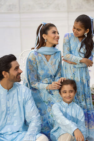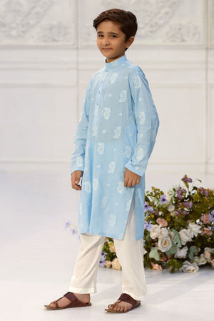 A serene blue hue defines this kurta, crafted with tonal embroidery that adds character without overpowering. The long sleeves and clean tailoring offer a neat, composed look, while the straight pants complete this effortlessly elegant ensemble.