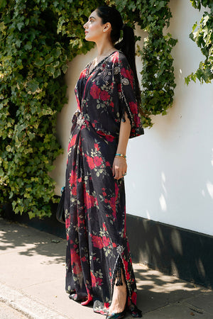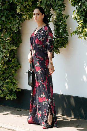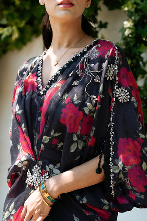 Celebrate Eid in style with our stunning black straight shirt from our new festive collection. Crafted from printed raw silk fabric, this exquisite outfit features Swarovski embellishments that add a touch of glamour. That's perfect this season.