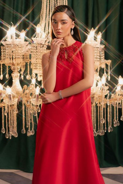 This captivating red ensemble exudes timeless elegance with a contemporary twist. The long shirt, crafted in a rich red fabric, is adorned with matching red embellishments, creating a seamless, luxurious look. The modern haultr neckline adds a bold, fashion-forward edge, enhancing the shirt’s sleek silhouette. The flared trousers provide a graceful contrast, flowing effortlessly to complement the outfit’s fluidity. Draping over the ensemble is an exquisite organza dupatta, its sheer texture beautifully highlighted with subtle embellishments that catch the light with every movement. The monochromatic red palette, paired with the modern yet regal design elements, creates a striking, refined look perfect for those who appreciate both understated elegance and bold style.