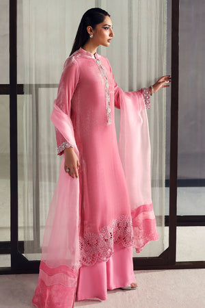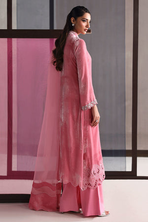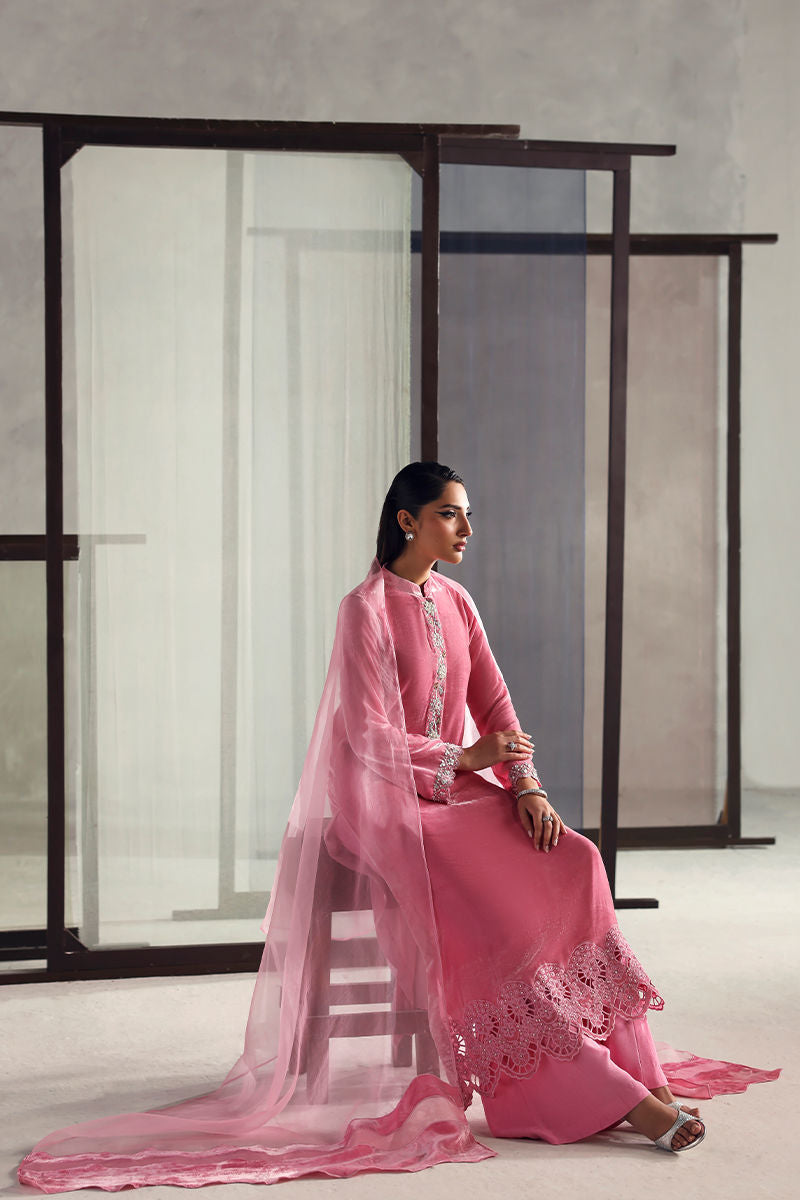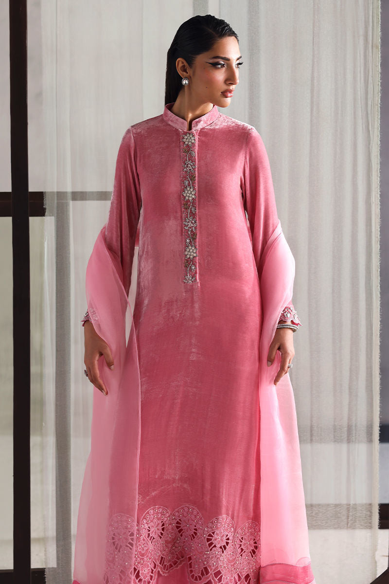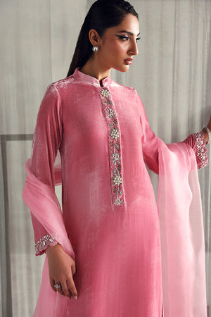 An elegant pink ensemble featuring a pure velvet shirt that exudes timeless grace, paired with a Korean raw silk palazzo for a refined touch. The look is completed with a pure organza dupatta, adding a hint of sophistication and effortless charm.