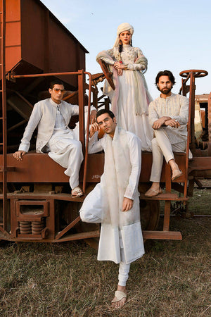 MNR Menswear's "Rawish" ensemble, features a white kurta crafted from ethereal cotton net fabric. Resplendent embroidery in pistachio green and tea pink dances across the chest, adorned with delicate mukesh accents. Paired effortlessly with plain cotton net trousers, the ensemble reaches its zenith with a tie-and-dye pure organza shawl. Intricately detailed with tonal block printed motifs and embroidery, this ensemble is the epitome of Eid elegance, seamlessly blending tradition with contemporary flair