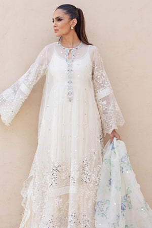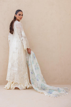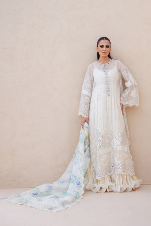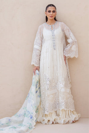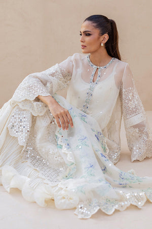 A vision of ethereal elegance, a flowing silhouette is cut in moonlit ivory, layered with sheer organza shirt that drapes over a sleeveless khaddi silk dress cascading into soft ruffled tiers. The keyhole neckline is traced with crystal accents and delicate embroidery, while voluminous scalloped sleeves shimmer with sequin and eyelet details. The hem is finished with intricate floral embellishment, glistening sequins and eyelet accents. Paired with a matching gossamer organza dupatta scattered in painterly florals of azure and jade, the ensemble evokes a sense of timeless romance.