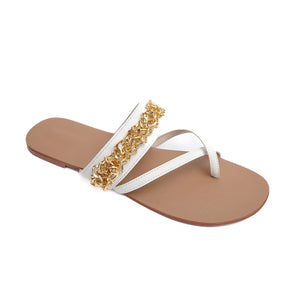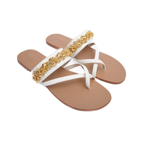 The Raya flat features a chain adorned with luminous crystals and metals set atop a leather strap. Featuring a cross-over toe-post, this is the perfect flat to transition from day to night wear.