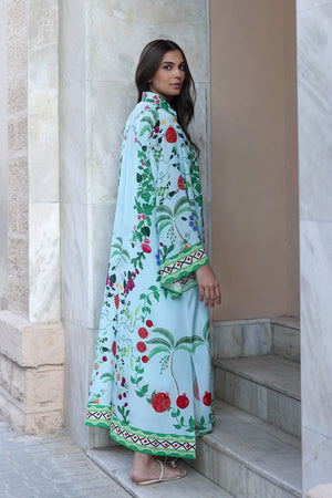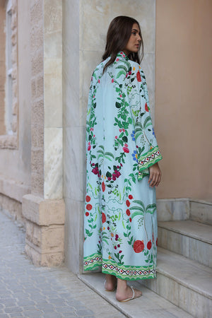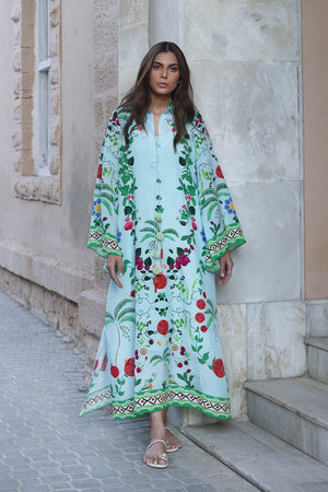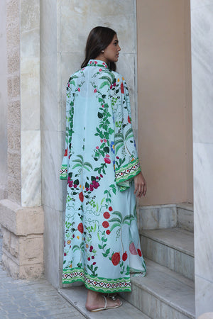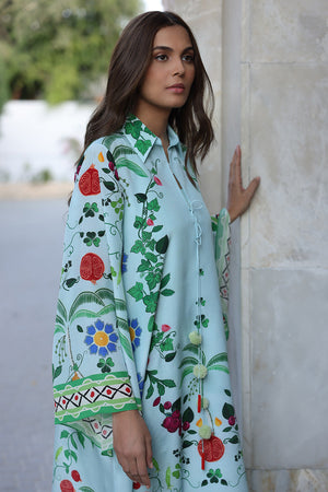 A tribute to nature, this flowing aqua hued crepe kaftan blooms with vibrant florals and lush foliage. Its elegant silhouette is enhanced by a collared neckline with a playful pompom tie closure with contemporary geometric borders on the hemline and dramatic bell sleeves adding a modern touch.